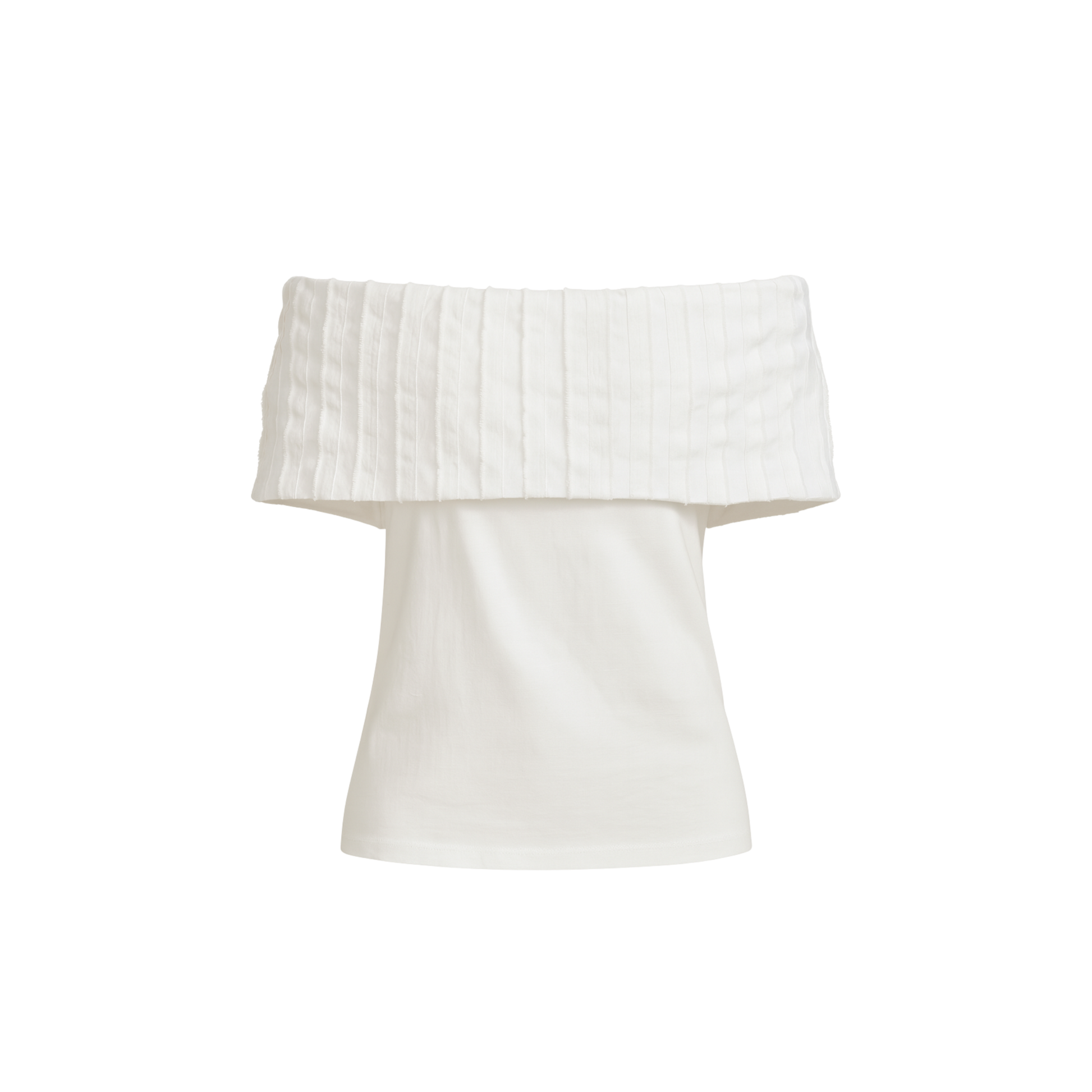 La Blusa Bandeja sin mangas en blanco destaca por su banda texturizada y escote hombro a hombro que realza la parte superior. Su silueta fresca y depurada aporta un aire ligero y moderno, ideal para looks luminosos y atemporales.