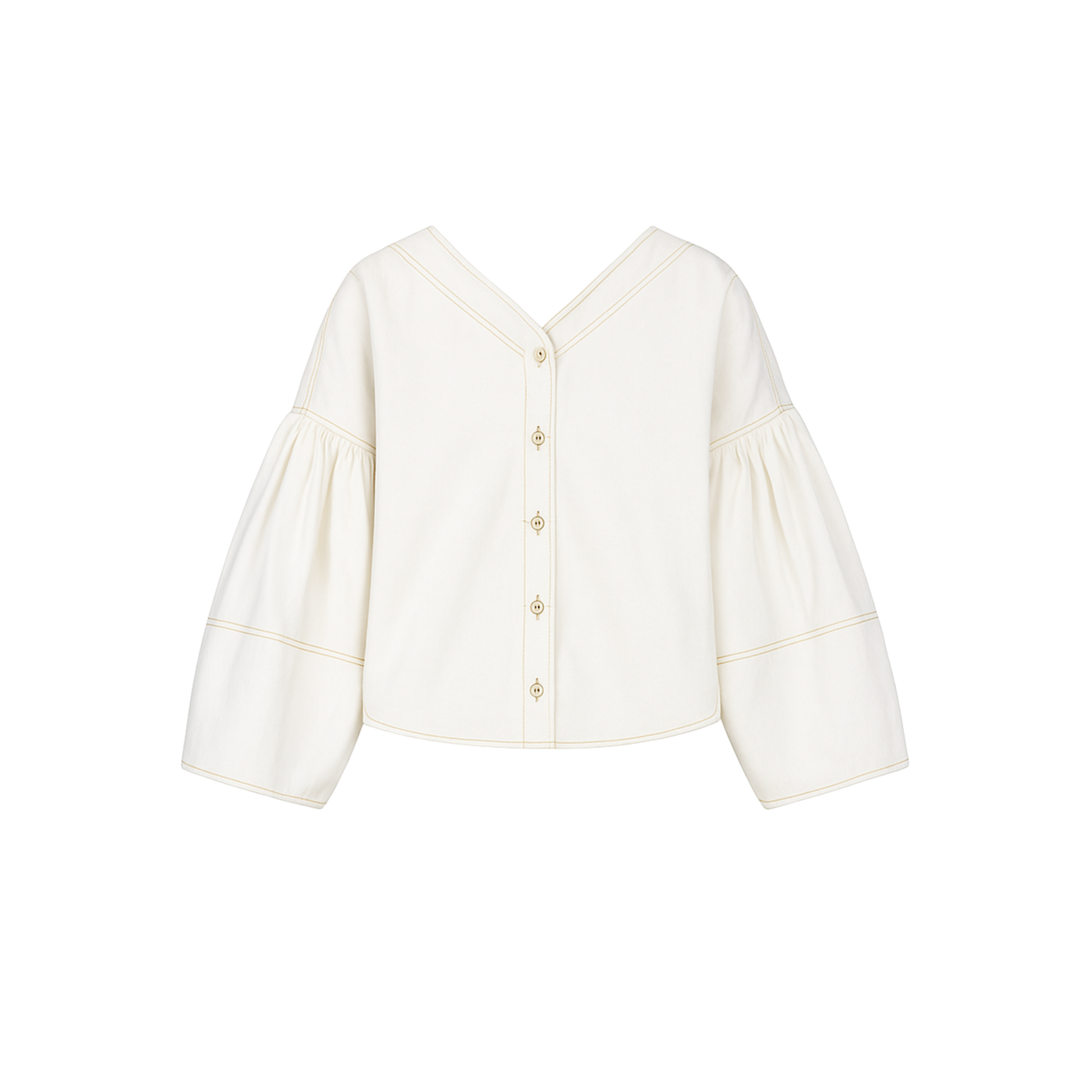 La Camisa Tulipán en blanco se distingue por sus mangas amplias tipo tulipán y su construcción delicada en el pecho. Con cuello en V, botonera frontal y una caída suave que equilibra volumen y estructura. Una pieza protagonista, femenina y sofisticada.