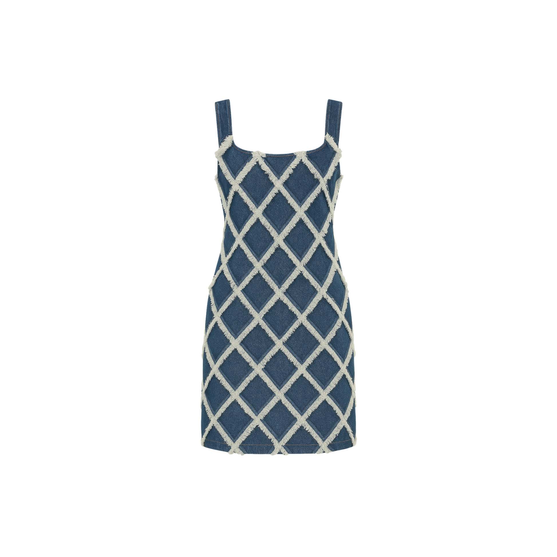 Confeccionado en denim azul y trabajado con un patrón geométrico de tiras deshiladas, el Mini Vestido Vitral ofrece una silueta moderna de líneas definidas. Sus cargaderas anchas aportan soporte, mientras que el largo mini y el juego de contrastes crean un look audaz con textura artesanal.